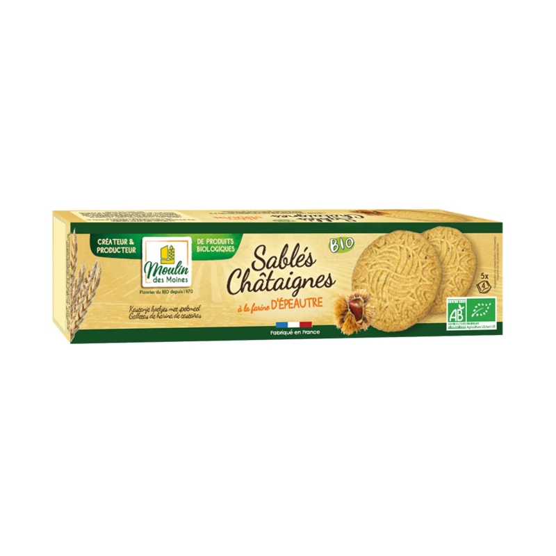 Farine d'EPEAUTRE T110* 46%, sucre de canne mi-blanc*, farine de châtaigne* 10%, huile de colza*, BEURRE (LAIT)*, AMANDES* broyées, poudre à lever (bicarbonate d'ammonium), sel marin. *Ingrédients issus de l'agriculture biologique.