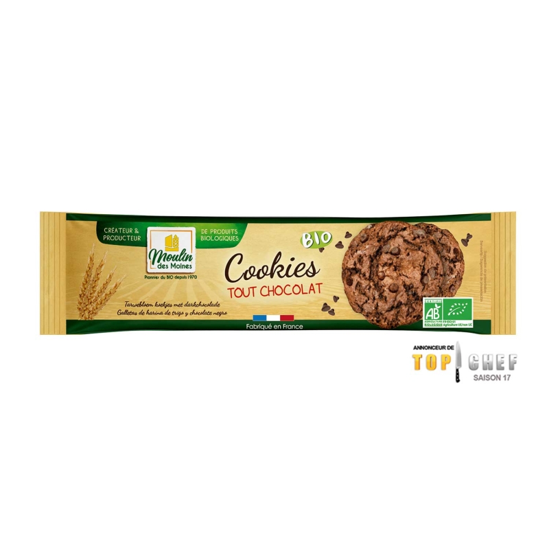 Farine de BLE T65*, pépites de chocolat noir* 30% (pâte de cacao*, sucre de canne*, beurre de cacao*, extrait de vanille*), sucre de canne*, huile de colza*, BEURRE* (LAIT), cacao en poudre* 2,5%, poudres à lever (carbonates d'ammonium et de sodium), OEUFS en poudre*, LAIT écrémé en poudre*, sel marin. *Ingrédients issus de l'agriculture biologique.