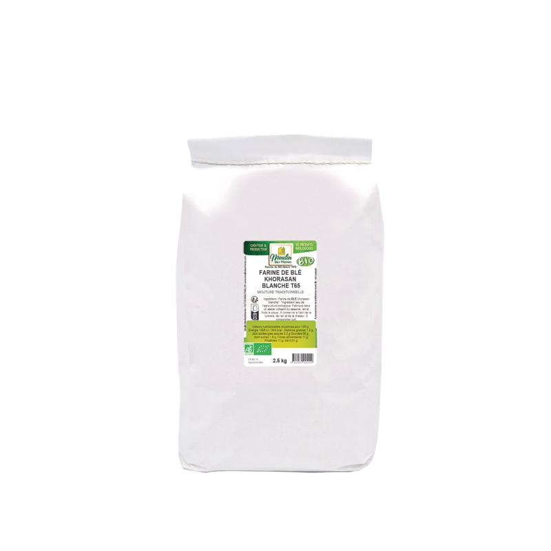 La farine de blé Khorasan blanche T65 bio est une farine particulièrement appréciée des boulangers. Cultivée selon les normes strictes de l'agriculture biologique, cette farine est issue du blé Khorasan, une ancienne variété connue pour sa saveur délicate et sa texture fine.