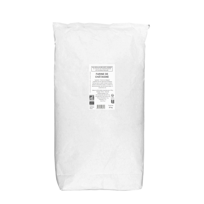 Découvrez notre farine de châtaigne bio origine France en format vrac. Élaborée à partir de châtaignes françaises issues de l’agriculture biologique, elle est finement moulue afin de préserver toute la richesse de son goût et de ses qualités nutritionnelles.