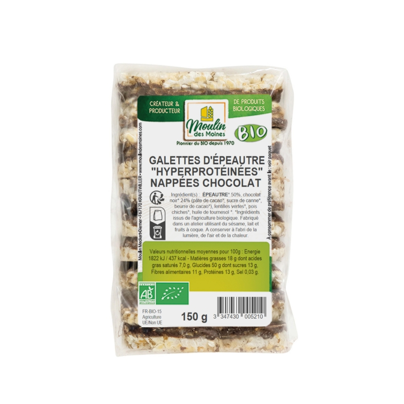 Riche en protéines et fibres, elle soutient vos efforts physiques en vous apportant l'énergie nécessaire pour relever tous vos défis. Sa texture croustillante et nutritive fait de cette galette un choix parfait pour les sportifs ou toute personne cherchant à maintenir un mode de vie actif et équilibré. Faites de nos galettes hyperprotéinés à l'épeautre et au chocolat, votre partenaire de bien-être et de performance.